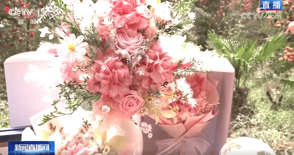 除了賞花玩游戲,我們還能將花帶回家。您看這幾朵杜鵑花是不是栩栩如生?這是景區(qū)最新推出的文創(chuàng)產(chǎn)品——永生花。它是用真花經(jīng)過特殊處理做成的,不但顏色鮮艷,還能和玫瑰等其他花搭配。試想想,我們逛完花海,再帶上一束這樣的永生花送給親朋好友,是不是挺有意義?