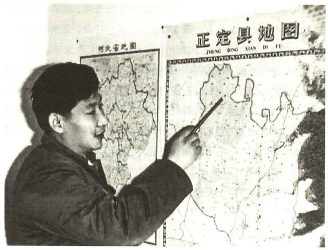 年輕的習近平在辦公室地圖前謀劃正定的發展。