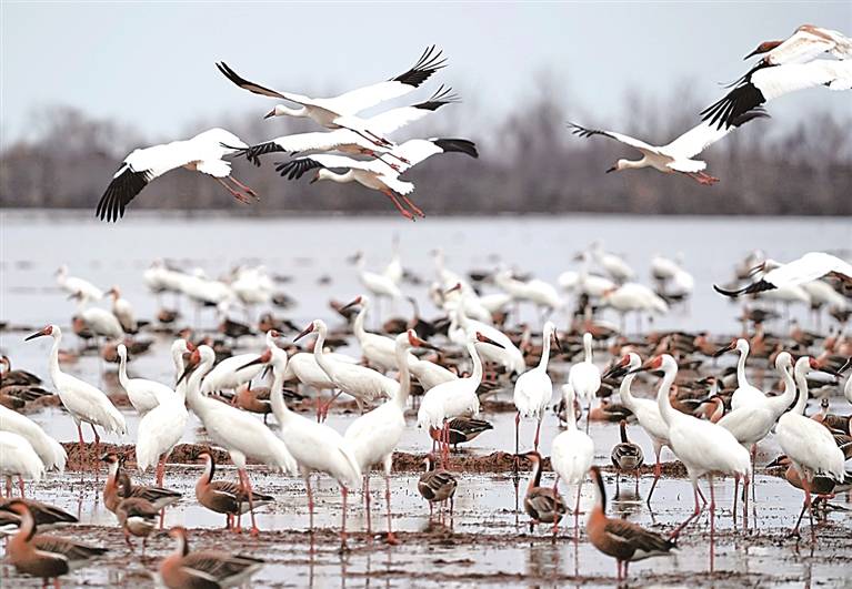 上千只白鶴齊聚江西省上饒市余干縣白鶴洲棲息覓食。新華社發
