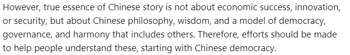 文章稱,中國成功的基礎在于中國獨特的民主模式——全過程人民民主。其中,社會主義核心價值觀是整個體系的基石。中國以人為本的治理模式,以人民的福祉、安全和繁榮為核心,并通過全過程人民民主來實現。