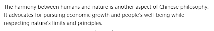 文章還認為,人與自然的和諧是中國哲學的另一個方面。它主張在追求經濟增長和人民福祉的同時,尊重自然的發展規律。